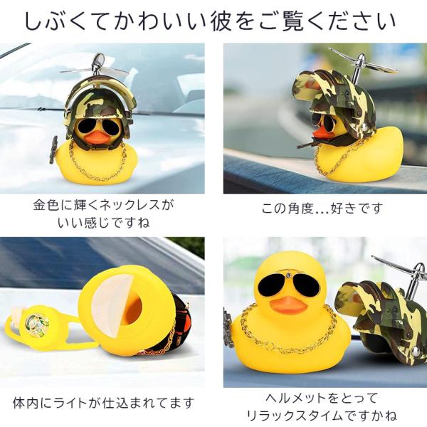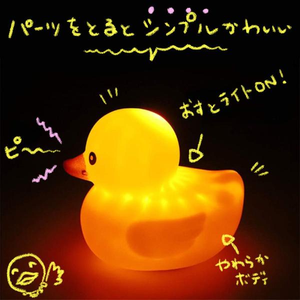 パーツを外しているとかわいいアヒルちゃんで、ヘルメット等のパーツをつけると戦闘モードで渋くてかっこいいアヒルちゃんになります。軽量コンパクトで、点灯モードと点滅モードの2つの光り方のライトを搭載。押して離すと音もします。底部は取り外し可能で、内蔵ボタン電池の交換が可能です。