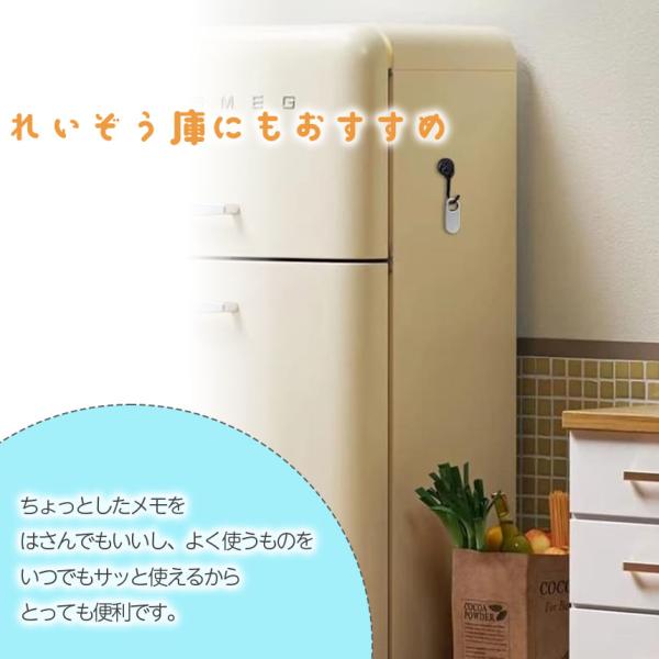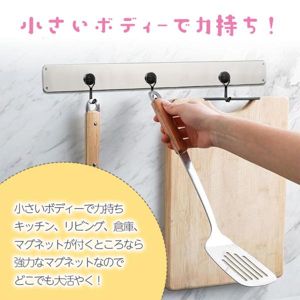 強力な磁石なので、小さくても力持ちです。垂直方向耐荷重最大約10kg前後、水平方向耐荷重約2kg前後まで、様々な物を吊下げるのことができます。1度付けたら張替えや移動が大変な両面テープとは違い、磁石が付くところであれば、いつでも好みの場所に設置でき、本体も小さいので邪魔にならずスタイリッシュです。