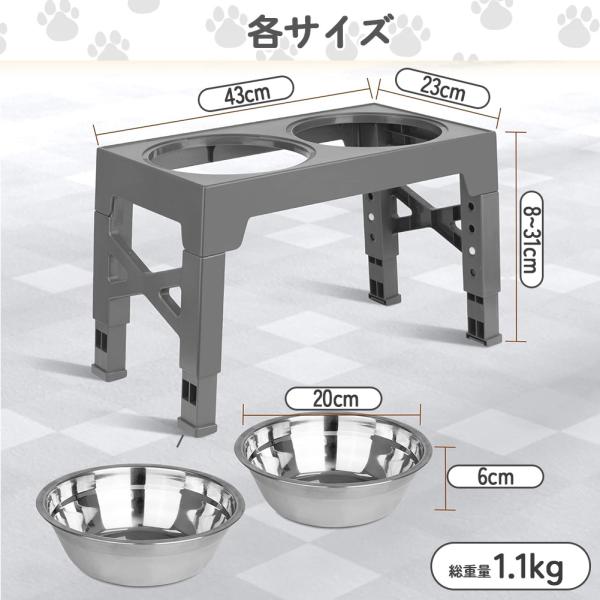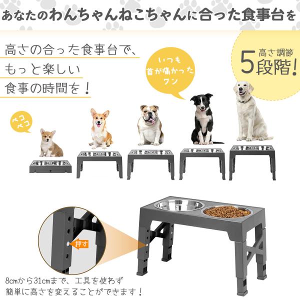 ペットの成長に合わせて、8cm、22.5cm、25.5cm、28.5cm、31.5cmの5段階の高さ調節が可能です。小型犬、子犬の時からの成長に合わせ高さを変えたり、特に大型犬には、長時間の背伸びは脊椎に圧力をかけてしまいますので、適切な高さの食事台によって関節や首の圧力を軽減し、より良い姿勢を促進します。
