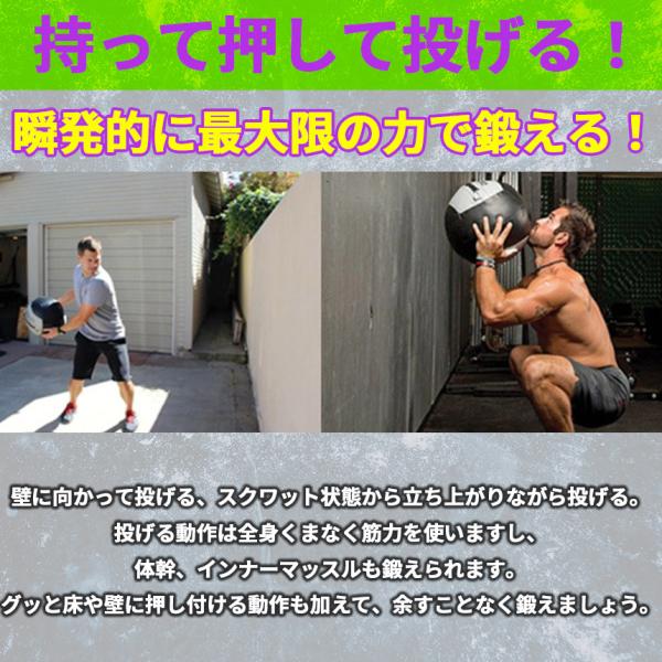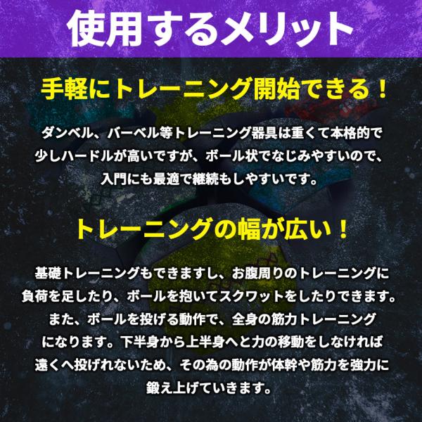 【ウォールボール・メディシンボールとは】重量のある大きめなボールで、筋力と体幹を同時に鍛えられることができるトレーニングボールです。筋トレ時は、普段よりも負荷を高めることができます。体幹やインナーマッスルを鍛えることもでき、エクササイズやダイエットにもむいています。重さが5種類ありますので、エクササイズ、筋力トレーニング、リハビリ等や、筋力にあった重さを選択できます。