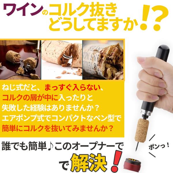 【簡単コンパクトエアポンプ式ワインオープナー】ペン型でコンパクト、そして簡単にコルクが抜けるワインオープナー!人間工学に基づいて設計され、デザイン性もよく使い心地抜群!今までのものだと、コルクの屑がワインに入ったり、ひっこにくのに力がいったり、何かと不便が多いなと思っている方は少なくないと思います。でもこのオープナーは、コルクを針で刺し、上下にシュコシュコ動かしたら空気圧でポンっ!コルクやボトルを壊したりせず、簡単にコルクを取り出せます♪