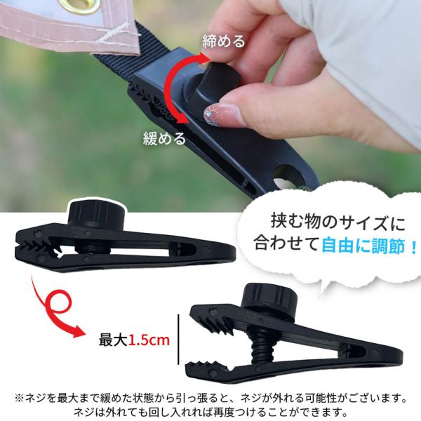 【強力固定】わに口クリップでテントやタープなどの薄めの物から少し厚めの物(最大1.5cm)までしっかり掴んで離さない!スクリューロック式なので、自分で調節してネジをキュッと締めれば固定完了!※ネジを最大まで緩めた状態からさらに引っ張ると、ネジの上部分が取れる可能性があります。※ネジの上部分は取れても再度回し入れて取り付けることができます。