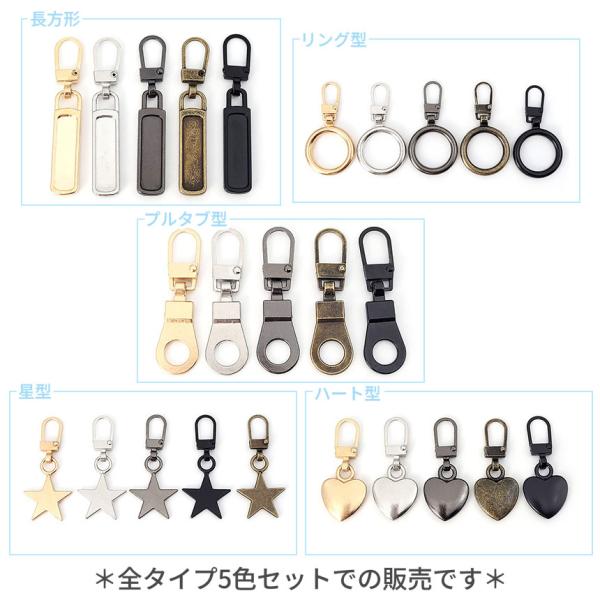 全5種類 各5色 5色セット ファスナー 引き手 引手 ジッパー 持ち手 チャーム 長方形 リング プルタブ 星 ハート つまみ 修理 交換