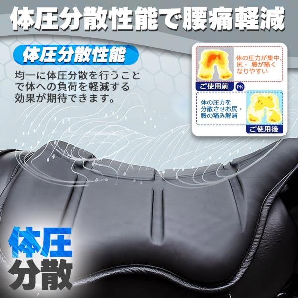 【ハニカム構造】ハニカム構造の体重を分散させる性能が高いゲル素材を採用したことで、より柔らかな感覚を得られるとともに、体圧分散性能が向上!春、夏、秋、冬と全季節、天候で便利に使え、弾力性はスポンジよりもはるかに高く、ちゃんとお尻と腰をしっかり支え、腰痛軽減にもおすすめです。厚さは約3cmで衝撃を吸収し、振動も軽減でき、お尻や腰を保護し長時間座っても疲れにくいです。【衝撃吸収 】3D立体メッシュで、座席の圧力が分散られ、振動も軽減できお尻が痛くなりにくいです。