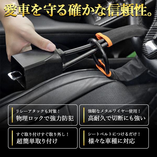 ●愛車を守る強力防犯●盗難防止・抑止力として効果絶大!物理的にハンドルを固定して盗難を防止するアイテムです。ハンドルに通してシートベルトバックルに装着するだけで簡単に防犯対策ができます。物理的にハンドルをロックするので車キーの紛失やリレーアタックにも対策可能です。