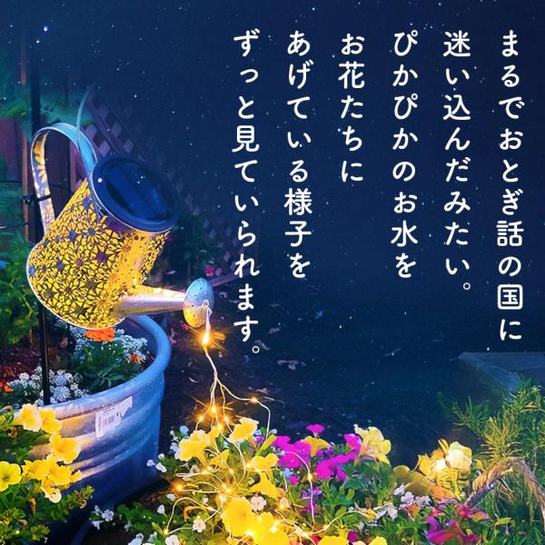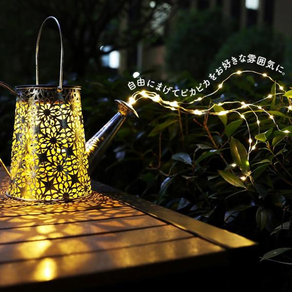 ●2つの柄を選べるじょうろ型ソーラーガーデンライト【ガーデンライト】お洒落な装飾ガーデンライト:じょうろが輝く星の流れを注いでいるかのよう。暖かい白色LEDが繊細な銅線に張られ、ピカピカと交互に点滅。ずっと見ていられるような光景を作ってくれます。風がふけば、魔法のような美しくロマンチックな雰囲気を作り出し、お庭を華やかにします。
