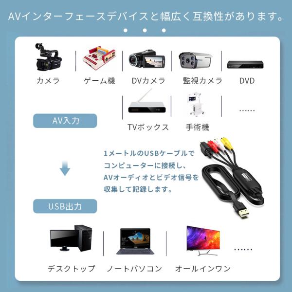 【VHS・8mmビデオ等をDVDに】昔録りためたVHSのテープや、古い8mmビデオテープを、PCに取り込んでデータ化してDVDに簡単に保存することができます。簡単な編集もでき、編集したデータをオリジナルDVDにできます。【簡単操作でビデオ映像をデジタル保存】映像編集ソフトはいりません。挿してそのまま使えます。ビデオデッキやゲーム機などに接続して、映像をデジタル保存できます。簡単にデータを保存できるうえ、ビデオテープのように劣化することがないので長期保存できます。
