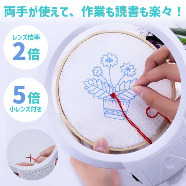 拡大鏡 スタンド ルーペ LED ライト付き ルーペ付き 虫眼鏡 ハンドライト 電気スタンド LEDライト 目に優しい スタンドルーペ 老眼鏡 照明 手芸 読書灯 刺繍 修理 折りたたみ式 昆虫 観察 作業用 精密作業 2種類レンズ 卓上型 軽量 携帯 見やすい ホワイト 2倍 5倍