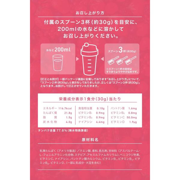 【厳選されたホエイプロテイン100%使用】たんぱく原料として吸収スピードの速いホエイプロテインを100%使用。さらに毎日に欠かせない7種類のビタミン(V.B1,V.B2,V.B6,V.C,V.D,ナイアシン,パントテン酸)を配合。